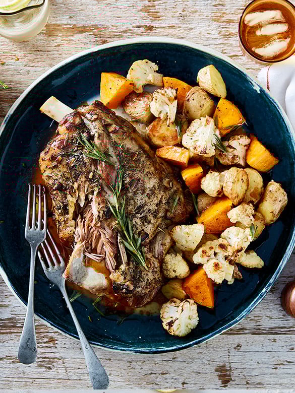 Serve lamb with roast vegetables, spinach and beans. Drizzle with pan juices and garnish with extra rosemary.